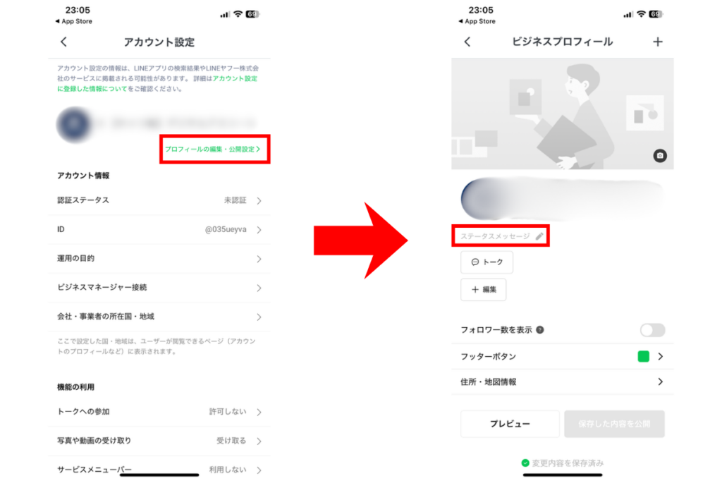 手順③:「プロフィールの編集」→「ステータスメッセージの編集箇所」をタップして設定を行います。