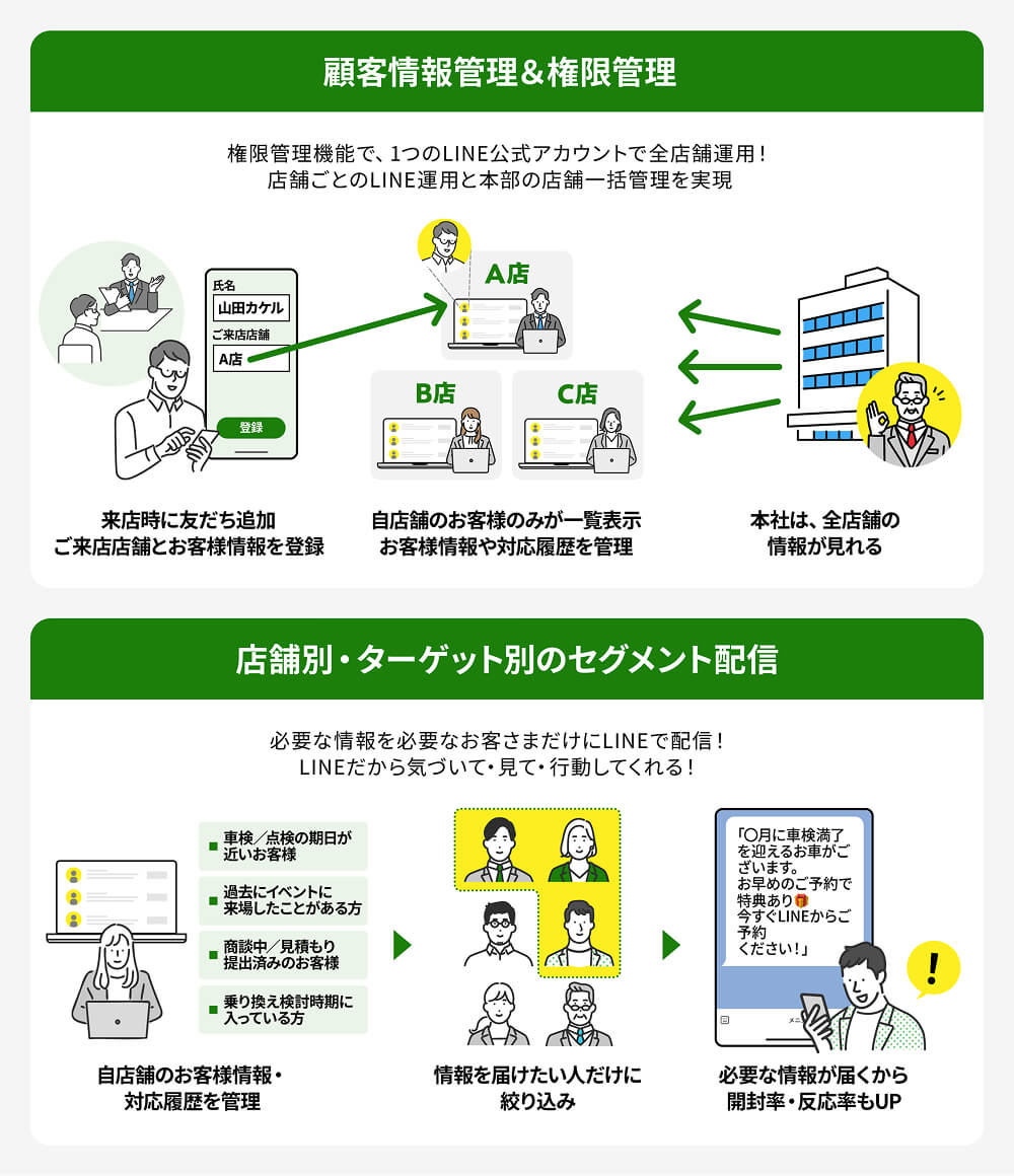 - 車検や点検のお知らせをLINE配信することで、予約導線もスムーズに → 入庫率アップへ