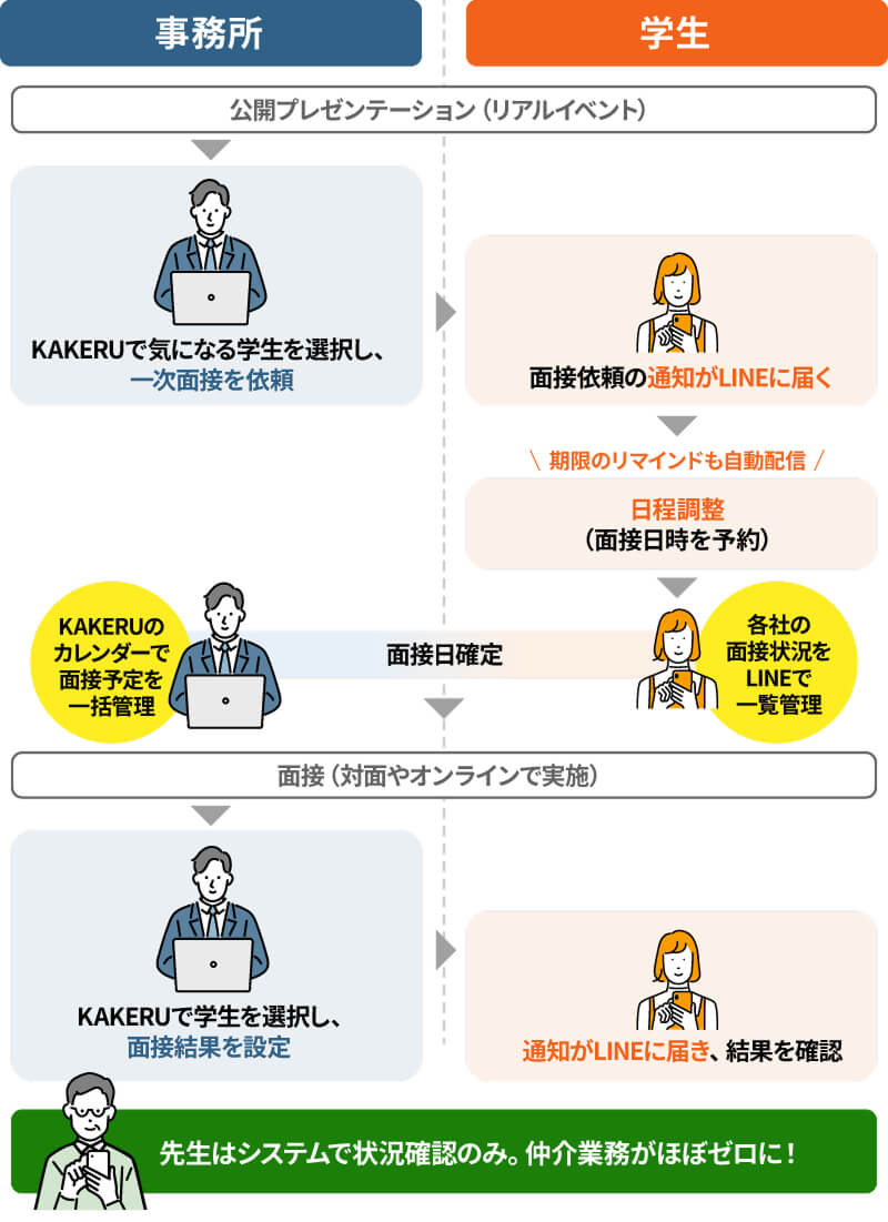 - 事務所・学生間のシステム操作で日程調整が完結。